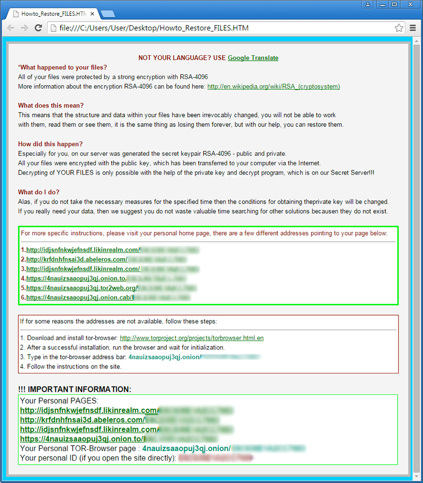 De una u otra forma, los usuarios infectados se encuentran a sí mismos en una situación donde sus archivos importantes del disco duro y de su red han sido codificados y por lo tanto no están disponibles. El troyano proporciona las instrucciones de restauración en un documento separado llamado “Howto_RESTORE_FILES, HELP_TO_DECRYPT_YOUR_FILES,” o algo parecido. Dice, “Todos sus archivos han sido protegidos por una fuerte codificación con RSA-4096” y lista los pasos para enviar la tarifa, la cual varía entre $300 a $500 dólares. El dinero debe ser enviado a una dirección de Bitcoin, especificada en las instrucciones.