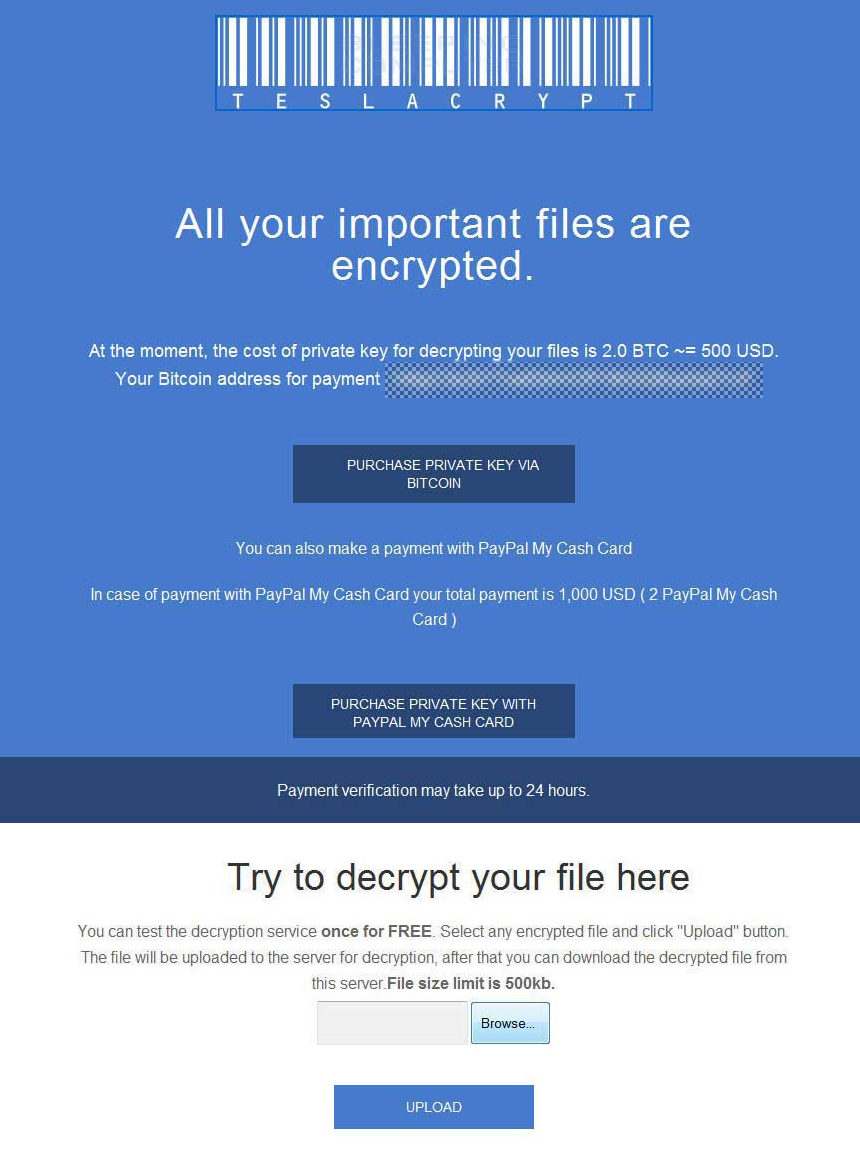 Las consecuencias de esta contaminación suponen también el lanzamiento de instrucciones de rescate en forma de how_recover + *. Txt y objetos .html en las carpetas cuyos contenidos han sido cifrado y en el escritorio. A diferencia de la gran mayoría de sus homólogos, TeslaCrypt utiliza el estándar AES para que los datos sean inaccesibles, mientras que los virus más extendidos como CryptoWall y Crypt0L0cker han estado empleando RSA-2048 en su lugar. Aunque el estándar de cifrado avanzado se considera que es más débil que el segundo sistema de cifrado de clave pública, todavía es lo suficientemente fuerte como para asegurar que las víctimas no son capaces de prescindir de ello. La suma del rescate es actualmente alrededor de 500 USD o, para ser más específicos, el equivalente Bitcoin de esta cantidad. Con el fin de enviarlo, el usuario debe hacer clic en el enlace de términos de referencia personal que redirige al sitio del Servicio descifrado con la funcionalidad de procesamiento respectiva.