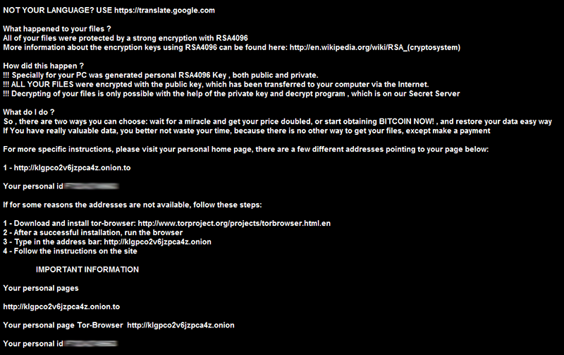 Algunos hechos reales ahora: el usuario afectado tiene que pagar 1,2 bitcoins, o 500 dólares, durante 96 horas ya que la infección comenzó originalmente se ejecuta en la estación de trabajo. Si se tarda en pagar, el rescate sube dos veces y es igual a 1000 USD. En caso de que el usuario hace enviar el dinero a través de varios idiomas “Descifrar Servicio” Tor (.onion) página, él o ella supuestamente puede descargar una aplicación de descifrador, lanzarlo, escanear la computadora para los archivos cifrados, y recuperarlos. De acuerdo con algunos informes de los usuarios, sin embargo, los delincuentes no cumplen sus promesas. Dadas las circunstancias, se recomienda probar las instantáneas de volumen truco, herramientas de recuperación de apalancamiento o restaurar los archivos de copia de seguridad.