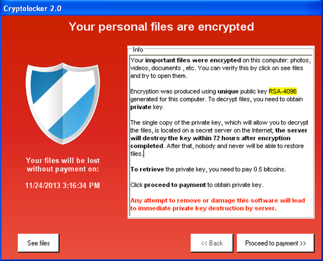 A continuación, el software malicioso abre una interfaz que dice “Sus archivos personales están cifrados”. La pantalla de advertencia continúa indicando lo siguiente: “El cifrado se generó utilizando la clave pública RSA-4096 generada para este equipo. Para descifrar archivos, necesita obtener la clave privada”. La víctima tiene un lapso de tiempo de 72 horas para pagar 0.5 BTC y conseguir realizar el descifrado. En caso de que el plazo no se cumpla, los operadores de CryptoLocker amenazan con destruir la clave privada y, por tanto, hacer que la información sea irrecuperable. Por cierto, el apetito de los estafadores parece haberse reducido ya que las ediciones anteriores de su malware extorsionaban con 2 Bitcoins, que son unos 700 USD. Sin embargo, incluso aunque la cantidad actual es 4 veces menor, no es un placer pagarla.
