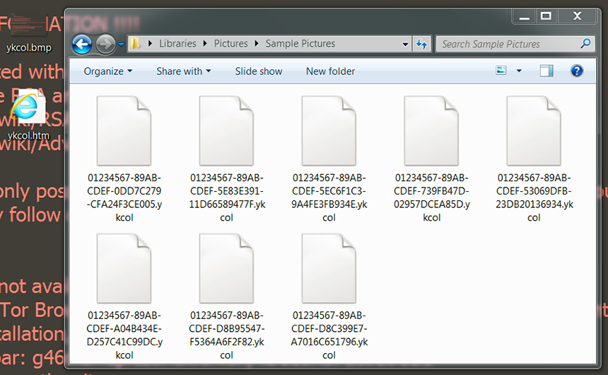 Los archivos del usuario secuestrado recibirán un hilo .ykcol al final de estos. Esta extensión es preparada con 36 artículos hexadecimales para hacer imposible el trabajo de encontrar estos archivos. He aquí un ejemplo: una hoja de cálculo llamada, Schedule.xls se convertirá en 644JU6XH-G0SPRFTE-0A5B2D4A-0A78AF2AB2FE.ykcol.